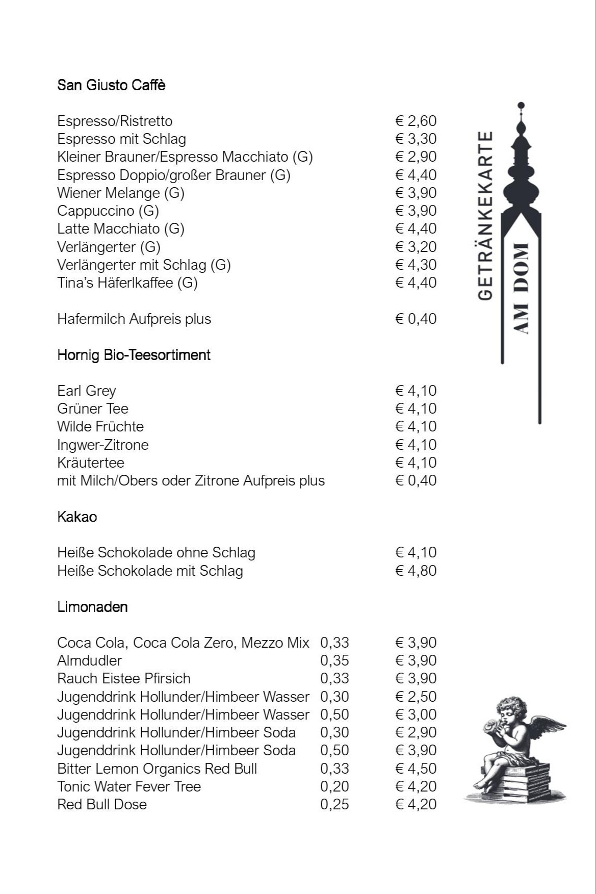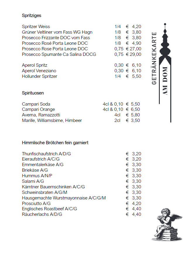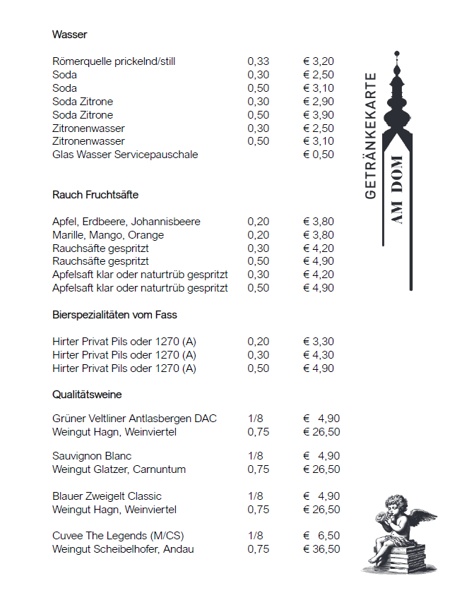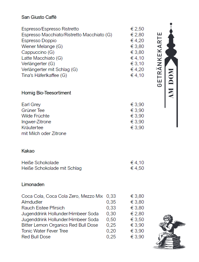 Lassen Sie sich nieder, genießen Sie den Blick auf den Dom bei einer herrlichen Tasse Kaffee, versüßen Sie sich den Tag bei einer unserer hausgemachten Mehlspeisen oder schenken Sie sich eine kleine Auszeit in der Mittagspause – wir servieren Ihnen tagtäglich köstliche, frisch gekochte Mittagsmenüs aus saisonalen und regionalen Produkten.